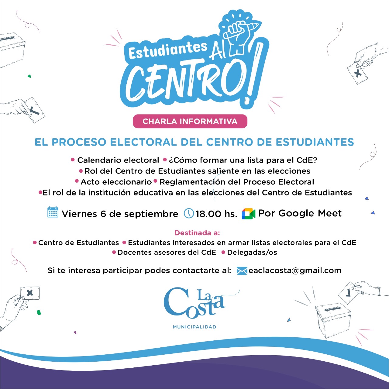Esta instancia está destinada a Centro de Estudiantes actual; estudiantes interesados en armar listas electorales; delegadas/os; docentes asesores. Quienes deseen participar deben contactarse vía mail a eaclacosta@gmail.com.