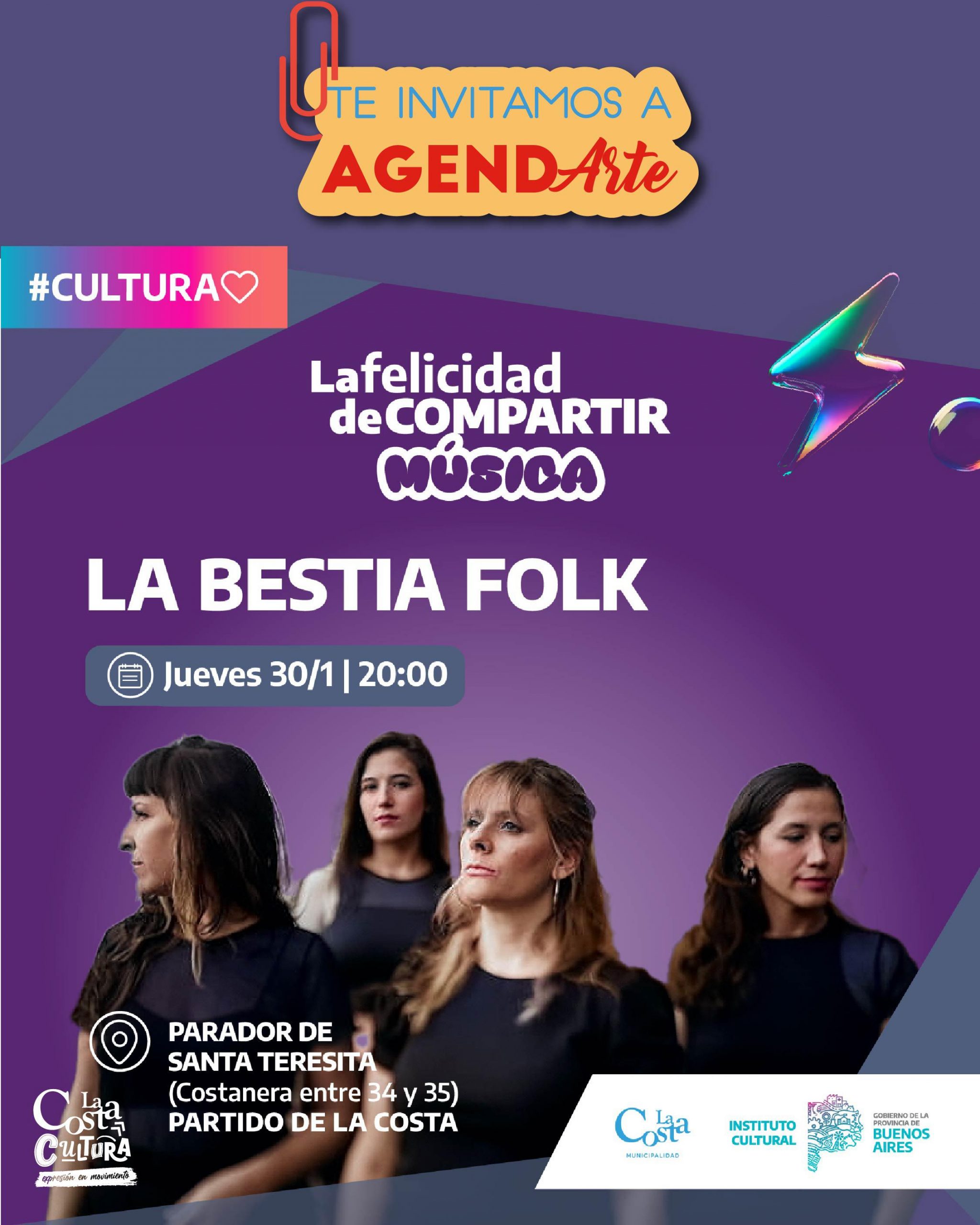 El próximo jueves 30 de enero, la Subsecretaría de Cultura de la Municipalidad de La Costa invita a participar de un espectáculo de música y cultura frente al mar con la presentación de La Bestia Folk.