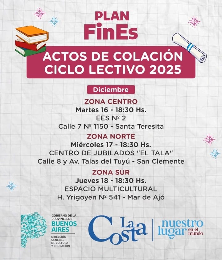 Diciembre marca el cierre del ciclo lectivo 2025 del Plan FinEs en el Partido de La Costa, con la realización de los actos de colación para estudiantes que finalizaron sus estudios secundarios.