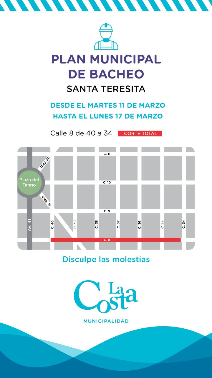 La gestión municipal impulsada por el Intendente Juan de Jesús, avanza con obras de mantenimiento del espacio público. El Plan Municipal de Bacheo sigue adelante en Santa Teresita y debido al desarrollo de los trabajos, habrá cortes de tránsito y se reducirá la calzada en varias cuadras.